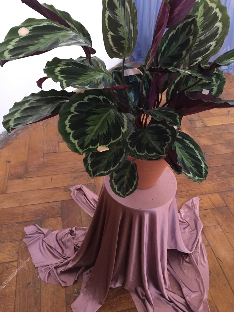The unknown work, on the other hand, is a bit trickier to read since there is no information about its background at my disposal. The living plant is a staple of the Viennese window-scapes, usually in the company of similar household plants, stacked to form a living barrier between the outside and inside. This cannot be anything else than a subjective observation, of course, yet it may shed some light on the fascination with the vegetative ready-made. Beyond that, the plant is a common element of private and public spaces, sometimes a bit dusty or part of a nicotine-ridden setting. The smooth drapery and the plaster are interconnected with a melancholic colour scheme that gives the piece a sense of corporeal intimacy, while at the same time, bringing forward an element of layering between the plasters, leaves, and the drapery, furthermore also achieving a certain levelling: a pictorial frame, into which the plant is drawn.