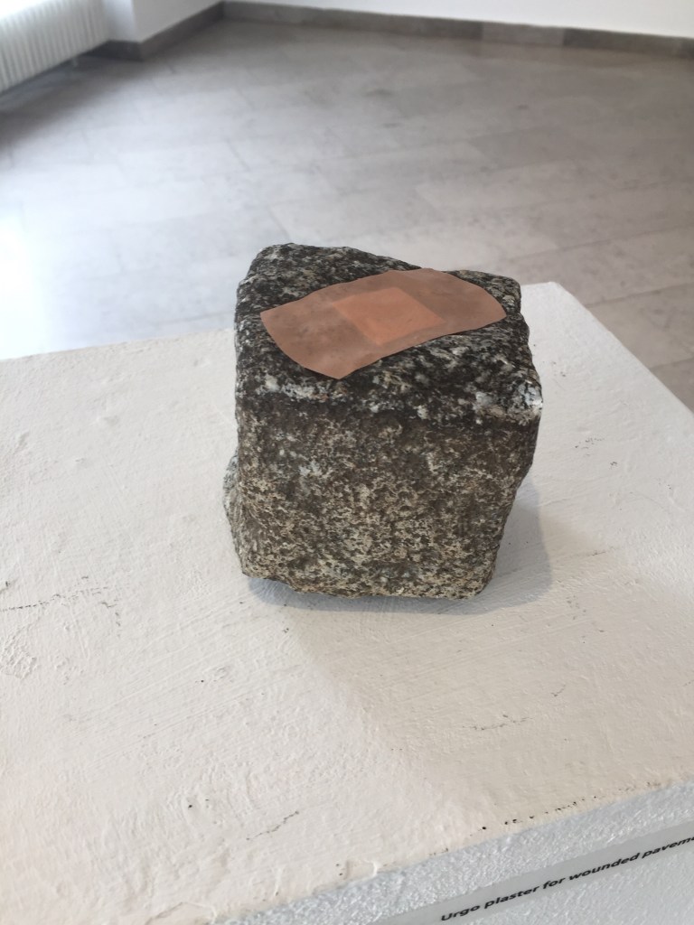The first work is, as the title plainly suggests, a pavement rock, supposedly wounded, and a plaster, covering the supposed wound. Daniel Djamo uses various objects, collected or found, to construct fictional spatial narratives. He primarily deals with the question of national identity and migration issues. The narratives are formed by and through the spatial relations between the used objects. This means that the exhibited works function less as autonomous pieces of art and more as elements of diagrammatic constellations. Talking about the piece ‘Urgo plaster for wounded pavement rock’ (exhibited as part of the exhibition ‘Past Futures’ at the Likovni Salon Celje), therefore means talking about a narrational element, to talk only about a part and not the whole itself.