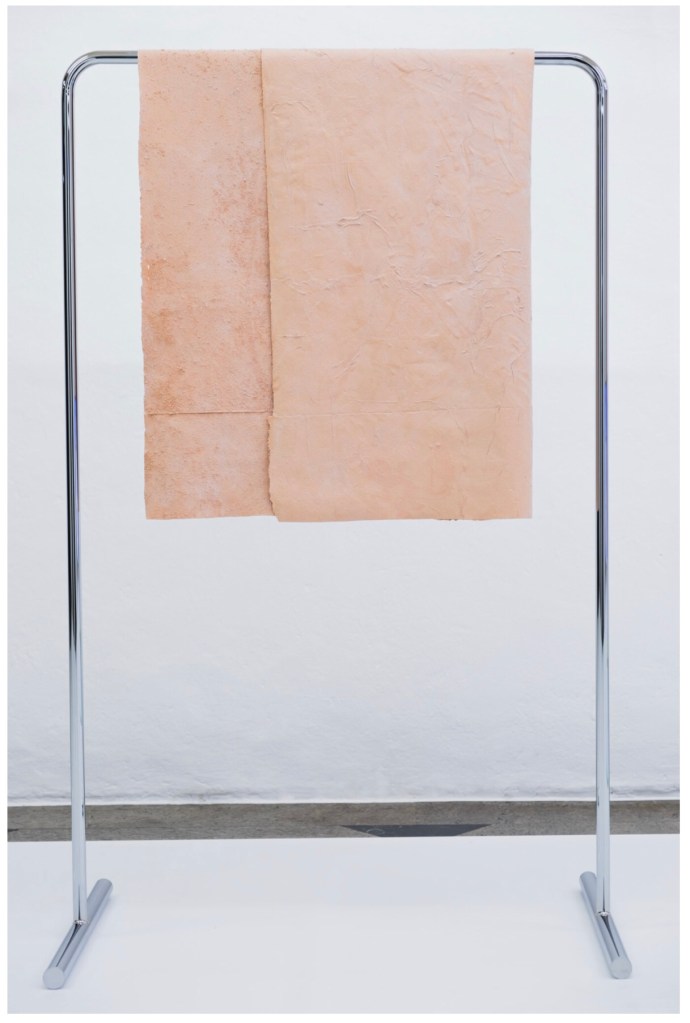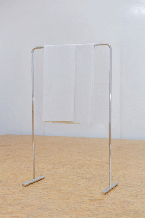 From pigment to glare, to discolouration, and from a stand supporting the vertical fold to the surface supporting a horizontal one, it wicks away the notions relating to water and modes of absorption in order to compose a dynamic, an intimate caress, of a peculiar hygienic endeavour.