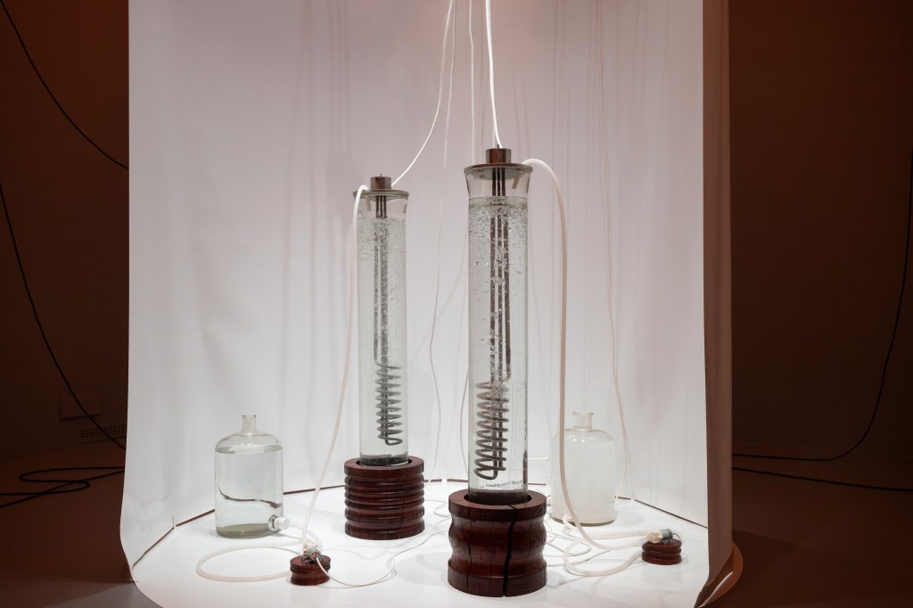 46.3532182, 15.1231226 is a fictional research project focusing on the accumulation of limescale — a compound of calcite, magnesite, and other minerals. The installation consists of two glass heaters and containers that supply them with water and mineral solution. The heaters, as sites where the non-precious “rock” is generated, are open to human view and thus to speculative impulses that seek some form of gain or yield in the material – either by maximising its value or its quantity/size. The apparent scientific character of the installation is thus compromised from the outset as the chemical process is opened to esoteric and mechanical contamination. Does the “foreign element” infiltrate the system through the dissolution of carbon dioxide in water? When heating leads to the formation of the precipitate? Or is the foreign element the gaze itself? Perhaps the intention inscribed through unusual mahogany pedestals and their carved motifs?