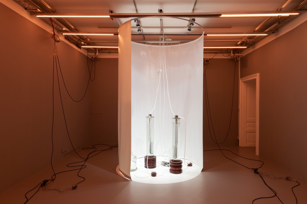 The work explores the boundary between the living and the non-living, between evolution and stagnation, and within the duo exhibition, where artistic projects of Oskar Kandare and Lara Žagar co-create a shared space of speculative thought, raises questions about the meaning of bare, purposeless existence and the possibility of autonomy in such mode of being.