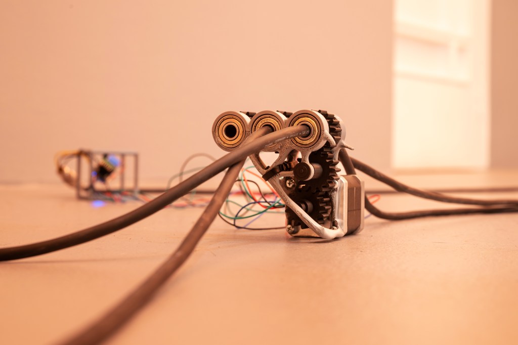 sys_6x3_CAT has connected itself to the room’s electrical system, disrupted the geometrically ordered arrangements of local power units, and redefined the function of its motors. Now, through its movement, it increasingly influences the sensory characteristics of the space, changing and observing it with its presence.